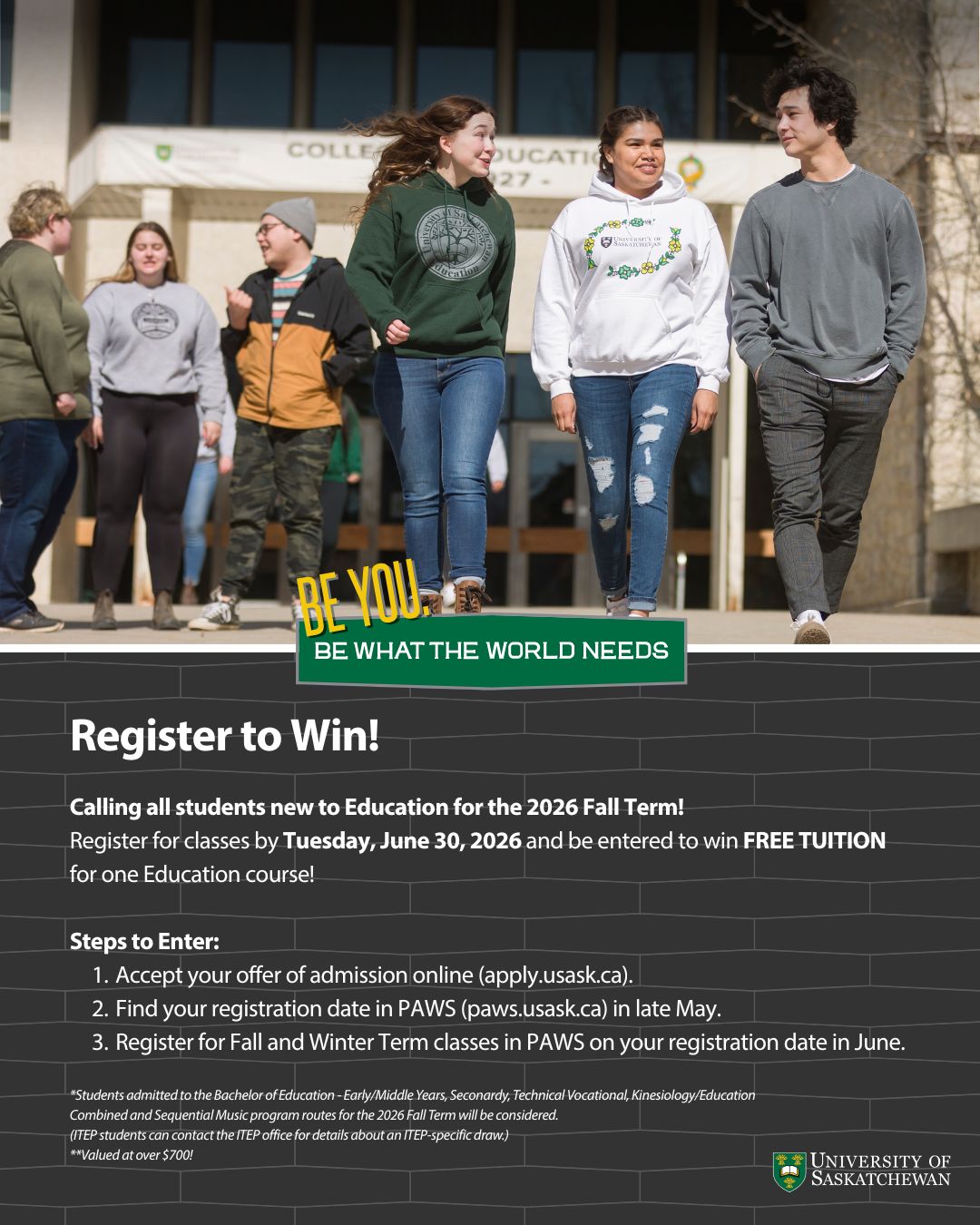 All students new to Education are encouraged to attend a U-Start session. U-Start is a pre-orientation to help new USask students prepare for university life. Sessions will be offered in May and June. When available, details will be posted on the U-Start webpage
