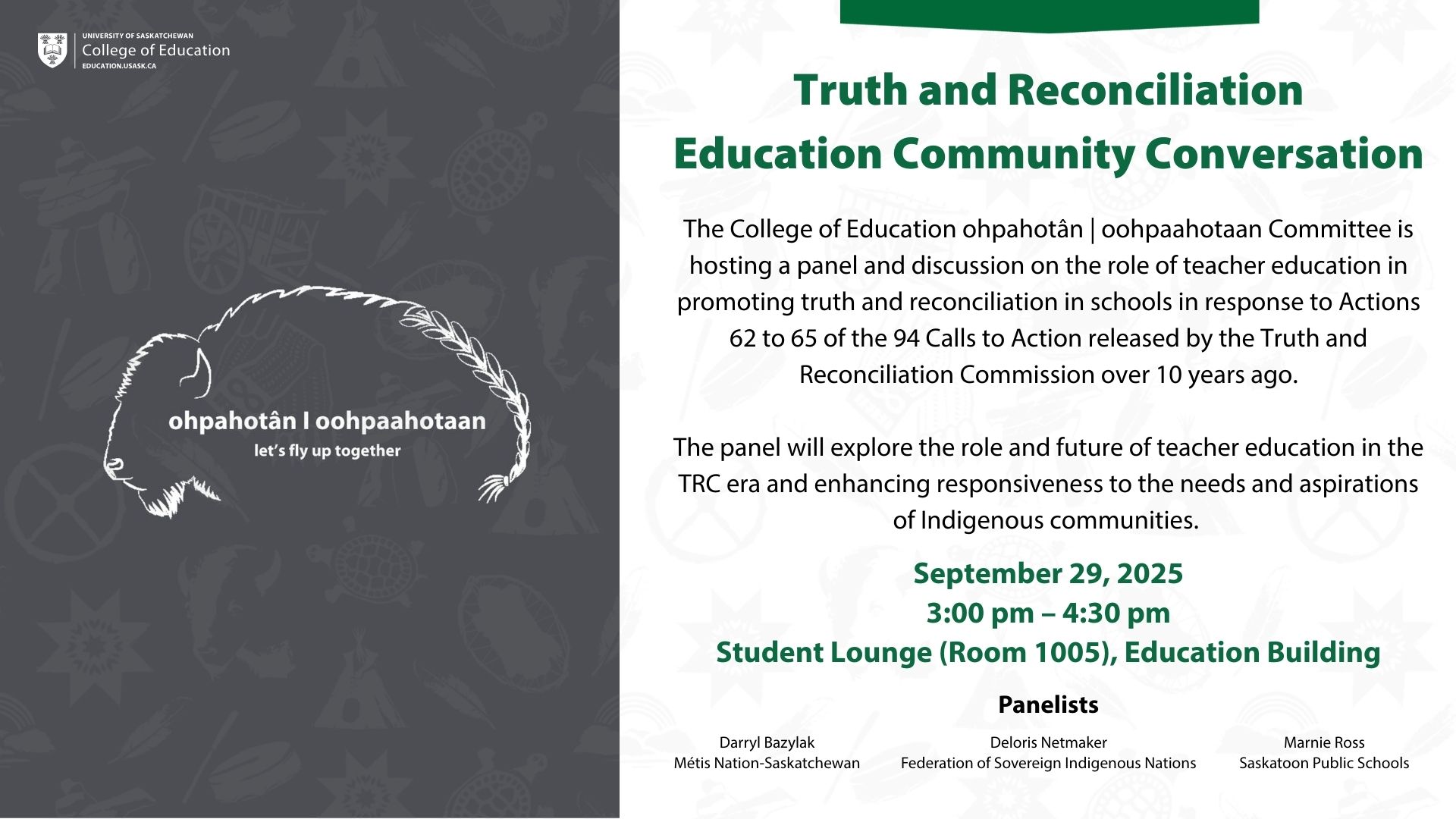 The panel is open to all College of Education undergraduate and graduate students, staff, and faculty, as well as members of the campus community. Teachers and leaders from First Nations, Métis, and provincial schools and organizations are also welcome to participate. We will reserve time for the panelists to respond to questions from the audience, and attendees are invited to meet the panellists in a reception following the discussion.