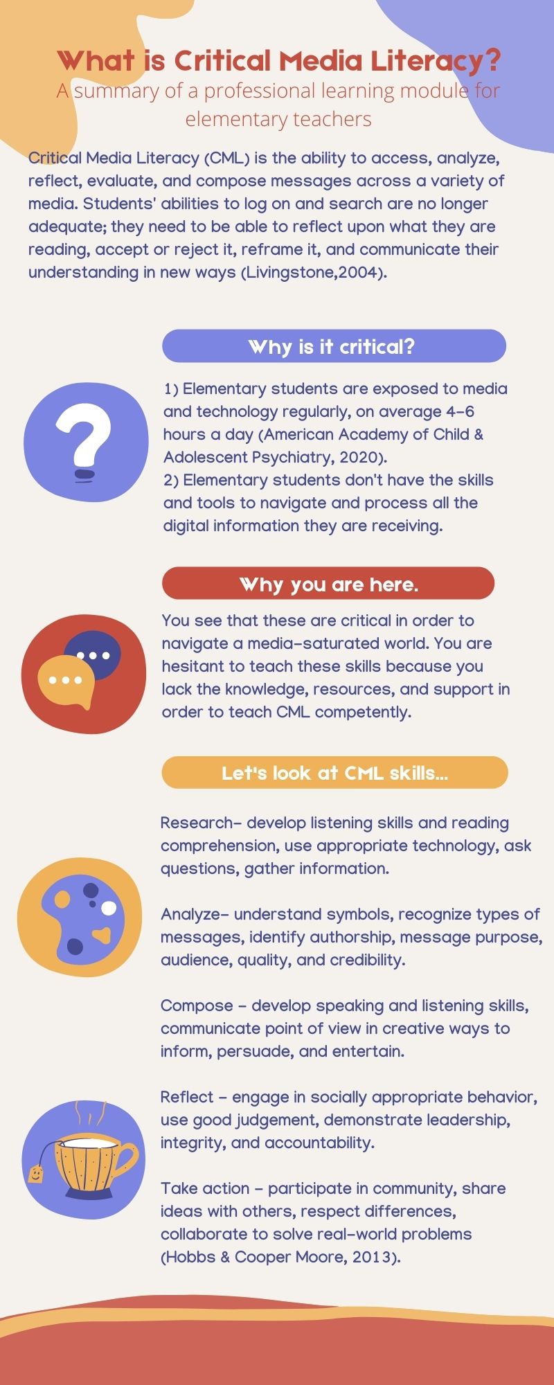 - Abstract: As a response to a growing recognition of the need for critical media literacy skills, educational institutions have included critical media literacy (CML) outcomes within curriculums across Canada. However, its placement as an additional topic of study or embedded in language curriculums for elementary students, diminishes its priority. This module for professional development examines elementary teachers’ perspectives of CML in Alberta, how they understand it and their frustrations and comfort levels in teaching it. The module offers a foundational understanding of CML, the skills associated with it, and lessons for classroom use in Divisions 1 and 2.
